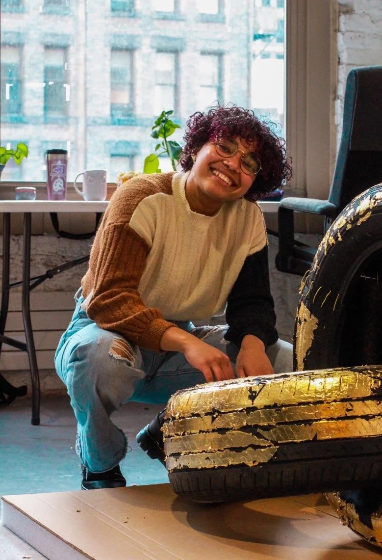 Her work centers around themes of identity, societal struggles, and emotions. Lasha enjoys the use of found objects and materials ranging from tires to slinkies to secondhand fabrics. The use of these materials is just as important as the narratives that she instills into her pieces. Her work is currently centered around surrealist figurative painting on second-hand fabrics.